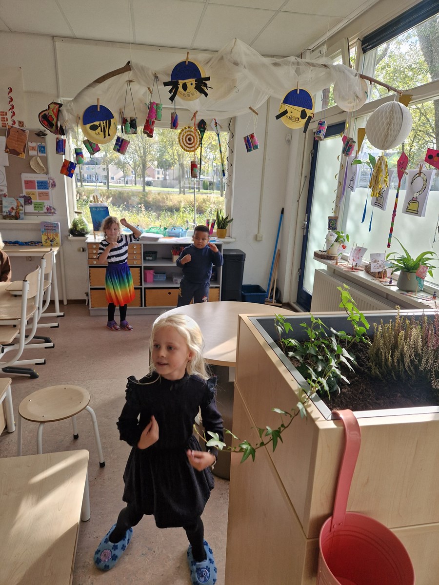 Deze week hebben we gedanst op het lied ‘Ga mee op avontuur’. Tijdens de dans moesten ze een rugtas inpakken, op zoek gaan naar avontuur, roeien bij de piraten en zweven in de ruimte.