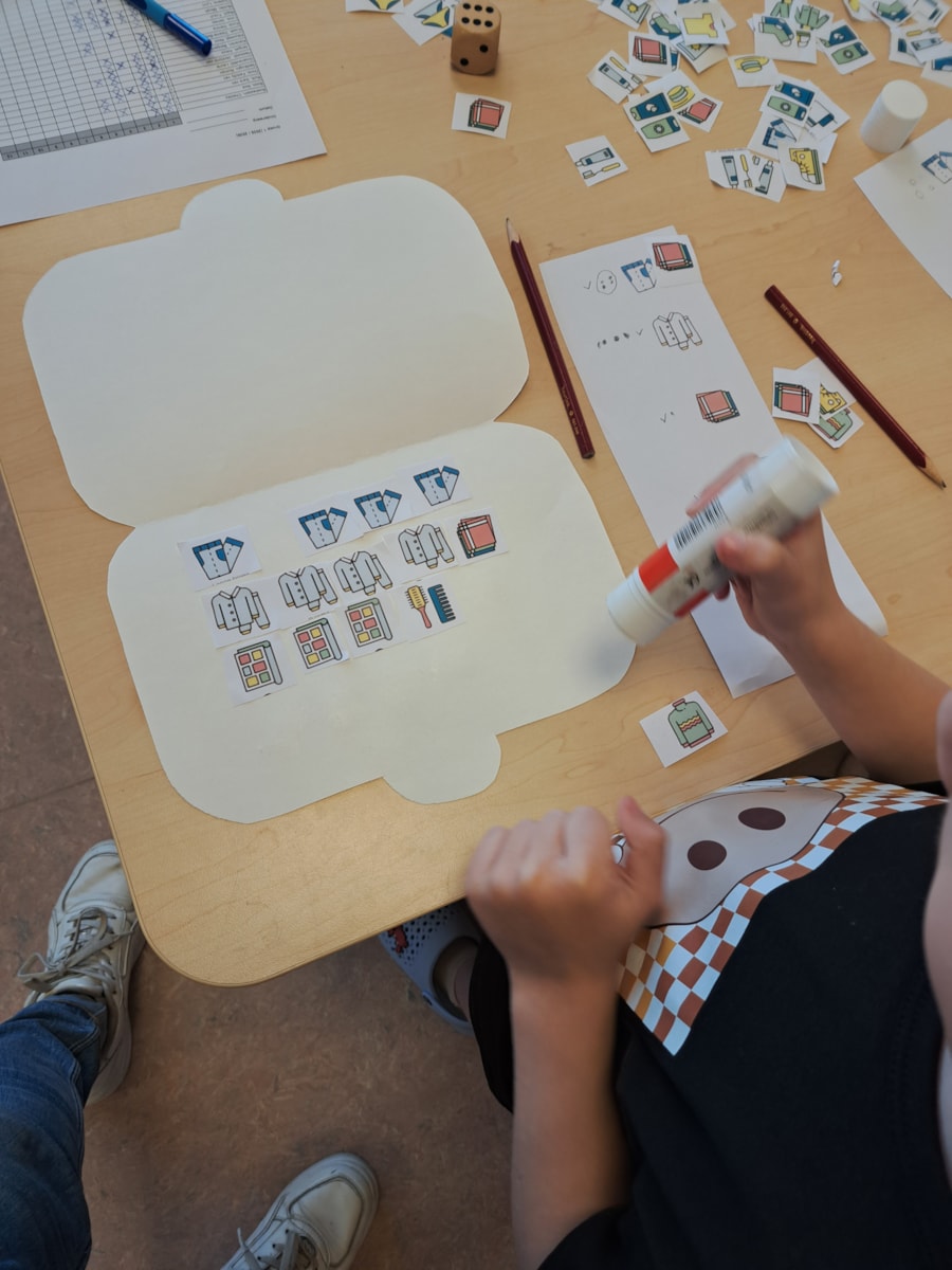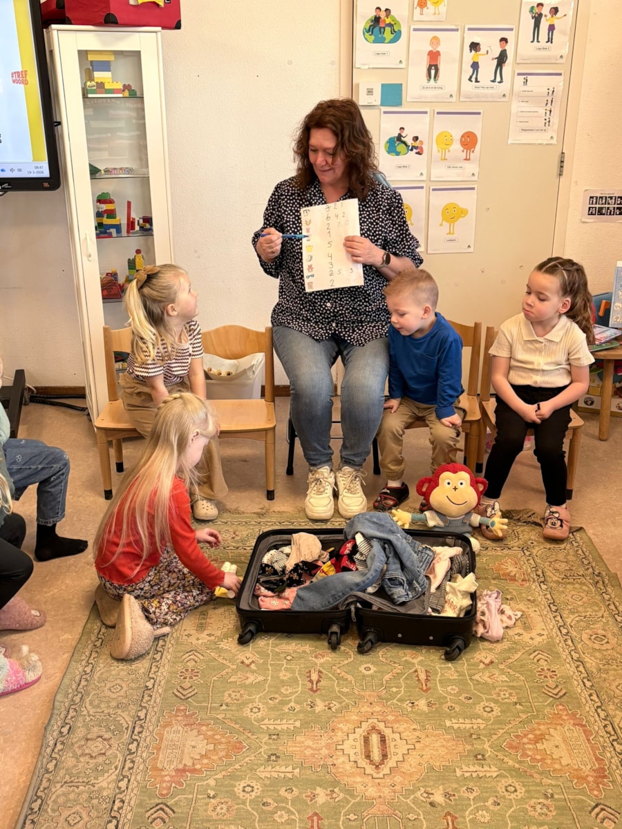 Ook hebben we Semsom geholpen met het inpakken van zijn koffer. Klopte zijn paklijst wel met wat er daadwerkelijk in zat? Zo niet, wat was het verschil? Daarna gingen de kinderen zelf aan de slag met hun eigen koffer en paklijst. Met behulp van een dobbelsteen werd bepaald hoeveel spullen ze mochten inp(l)akken, een speelse en leerzame activiteit!