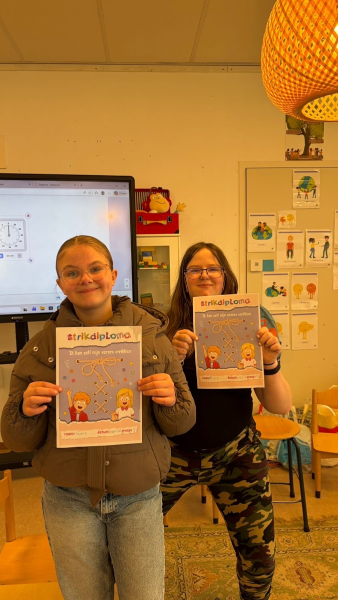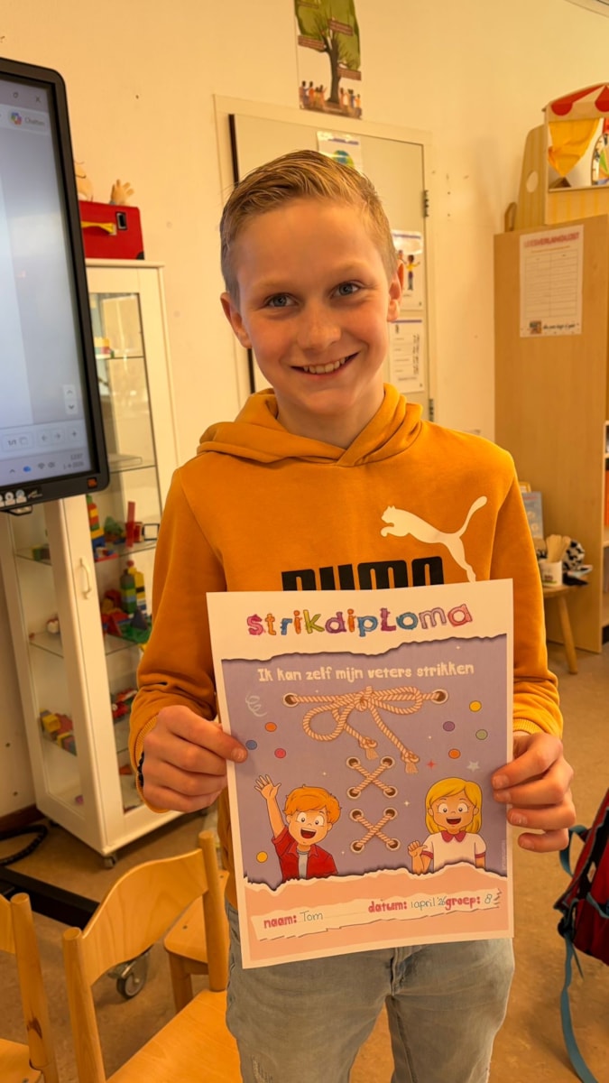 Verder heeft een gedeelte van de kinderen hun veterstrikdiploma bij de kleuters behaald! Sommigen hadden niet direct door dat het 1 april was!